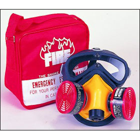 此型面罩專用於火災現場緊急逃難濃煙區,使用時間約二十分鐘,每個面罩均附有紅色保存袋,可掛於牆壁上。